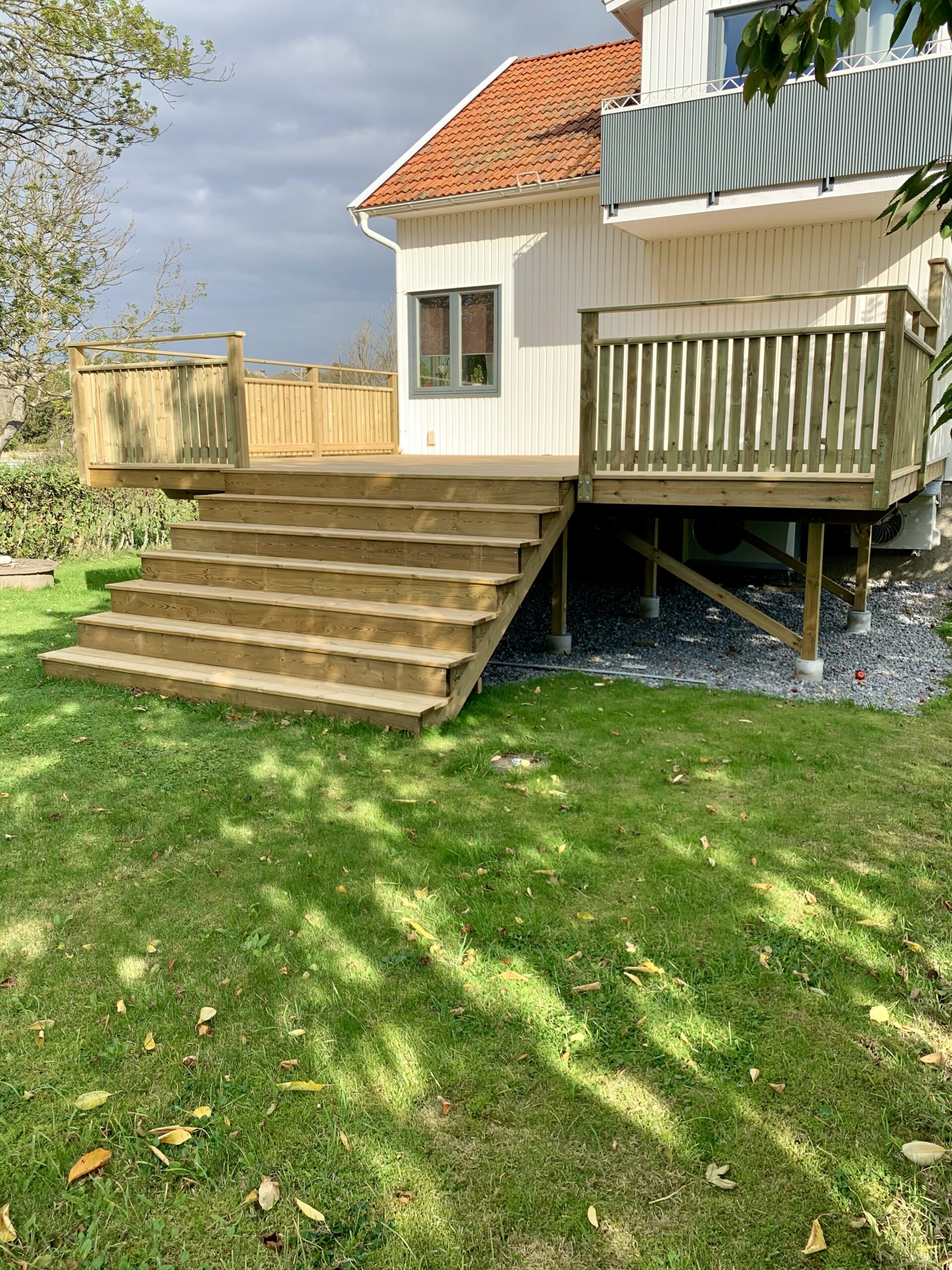 Vi har byggt och färdigställt en altan åt kund – stabil stomme, snyggt trallmontage och noggranna avslut för ett hållbart resultat.