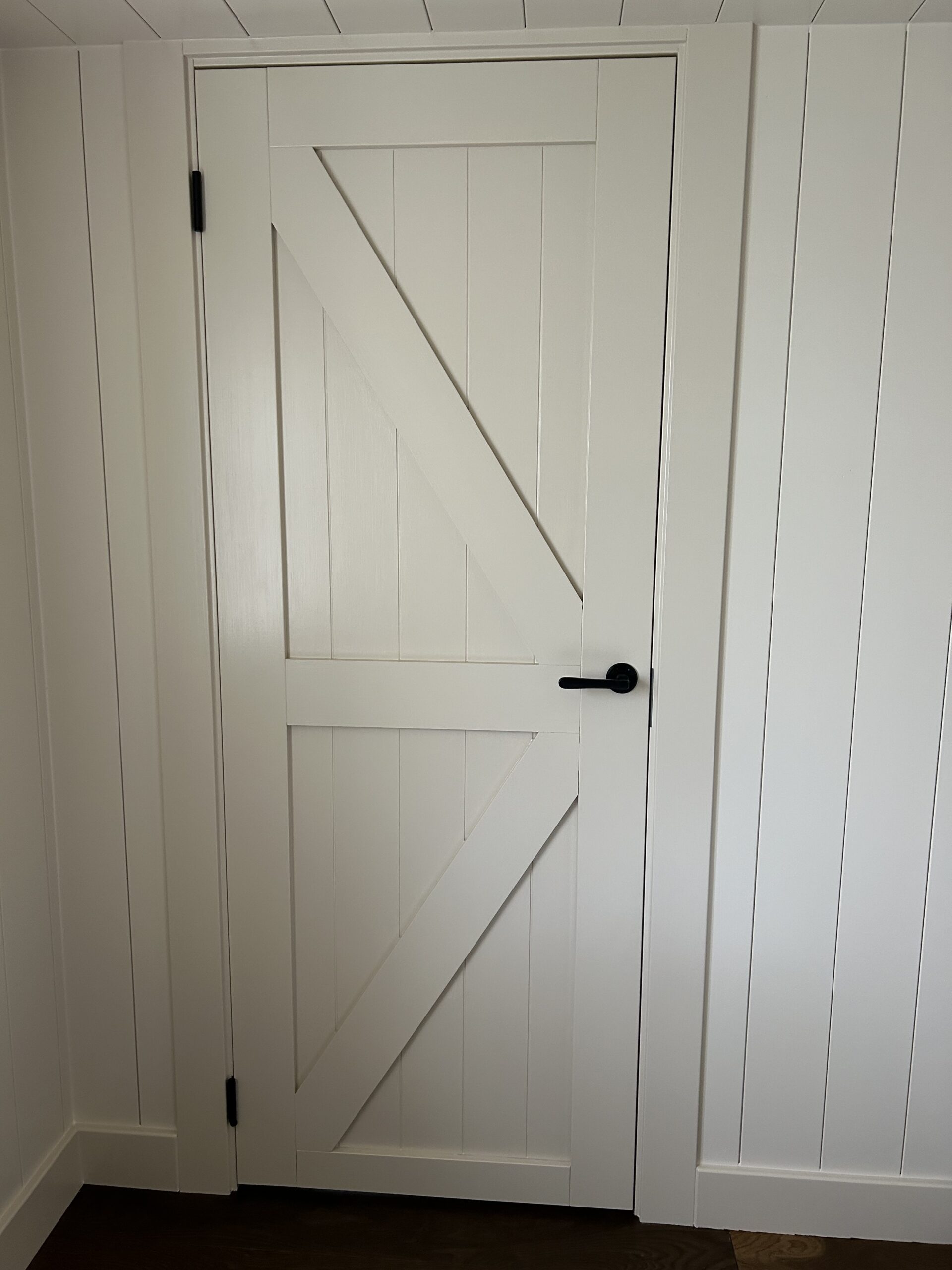 Vi har spårat en slät innedörr, satt nya lister och målat för ett fräscht, enhetligt och hållbart resultat.